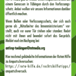 Wenn Bullen oder Verfassungsschutz, der sich auch gerne als „Mitarbeiter des Innenministeriums“ vorstellt, auch vor eurer Tür stehen oder standen: Redet nicht mit ihnen und beendet sofort das Gespräch. Meldet euch im Nachgang bei antirep-tuebingen@mtmedia.org